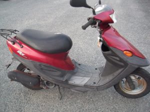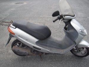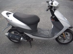 エンジンが壊れてしまっている車体です。おまけにマフラーに穴も空いてしまっているようです。2ストロークのモデルなので、アドレスV125のような4ストに比べてエンジンの耐久性はありません。この車種はある程度距離を乗るとマフラーに穴が空いてしまうようです。よく穴の空いている個体を見かけます。街中で乗っているのを見るものめっきり減りました。前期型は鉄ホイール、後期型はキャストホイールです。無料にて引き取りました。